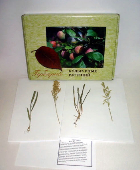 В гербарии представлены 28 видов  наиболее распространенных культурных растений: зерновых, зернобобовых, масличных, технических, лекарственных, овощных, кормовых, плодово-ягодных, орехоплодных и декоративных. Список с наименованиями растений прилагается. Засушенные растения наклеиваются на гербарные листы (формат А3). Растения, у которых определяющим элементом является не только побег, но и соцветие,  и плод, представлены двумя или тремя объектами.  В этикетках на гербарных листах указаны краткие описания растений. Изделие упаковано в коробку с маркировкой.