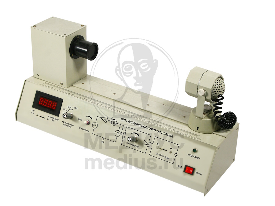 Установка для изучения фотоэффекта и определения постоянной Планка включает в себя источник света с плавной регулировкой яркости, вакуумный фотоэлемент, источник питания цепи фотоэлемента с плавной регулировкой выходного напряжения и переключением полярности, усилитель постоянного тока с переключением диапазонов, цифровой индикатор с  переключением режима вывода данных (ток / напряжение) и 5 светофильтров, которые могут быть поочередно установлены перед фотоэлементом. Источник света и фотоэлемент установлены на направляющей скамье, расстояние между ними  изменяется и определяется при помощи шкалы, расположенной на скамье. В установке используется лампа 12 В/ 35 Вт. Установка работает от сети с напряжением 220В, имеет габаритные размеры 250х150х500 мм.